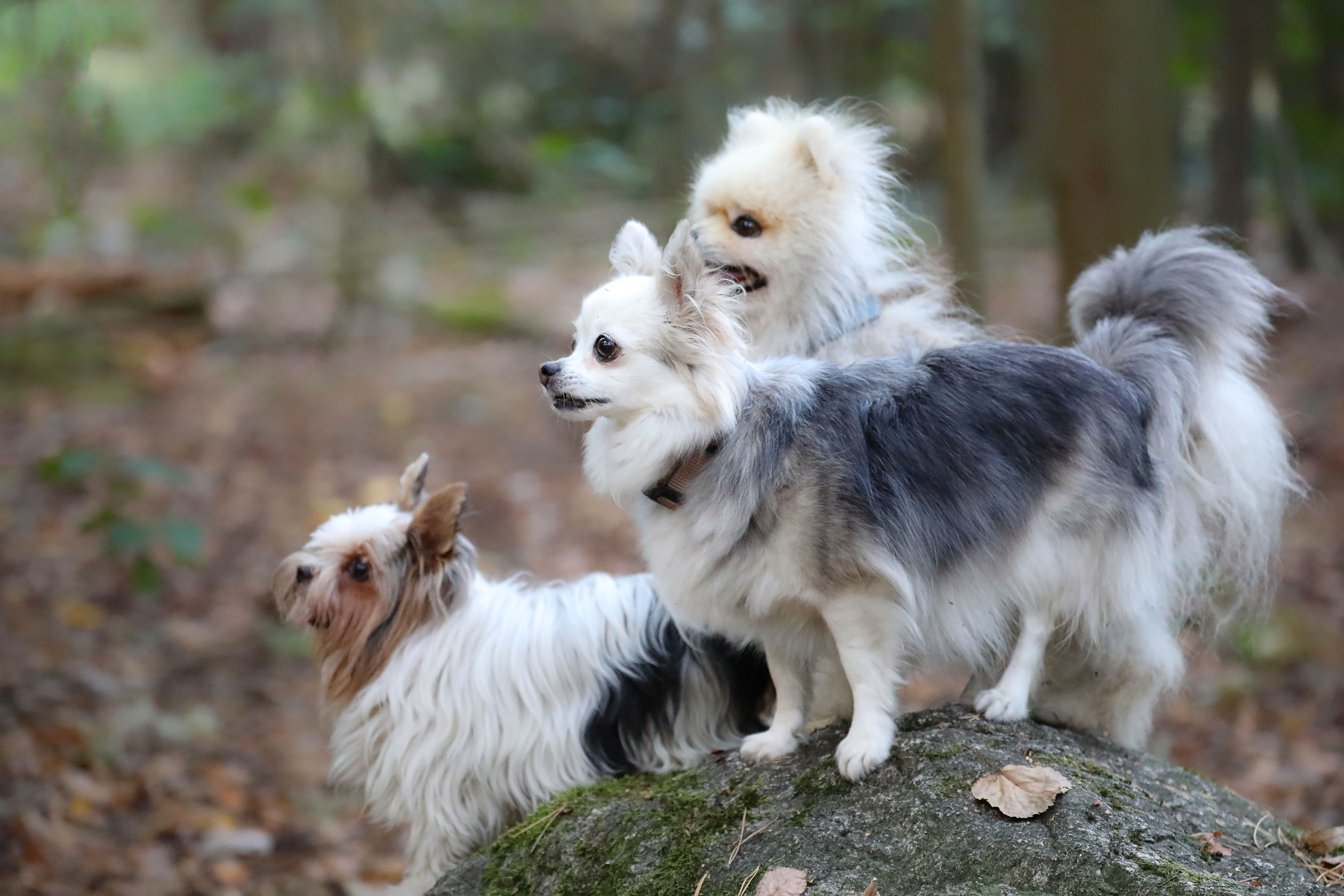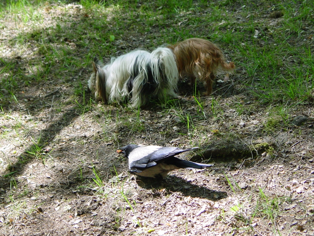 Hunde und Krähe bei Leckerlisuche